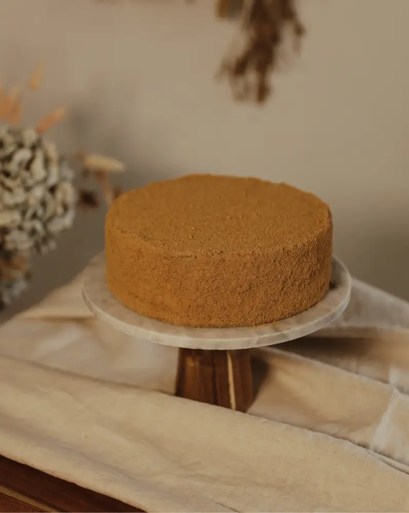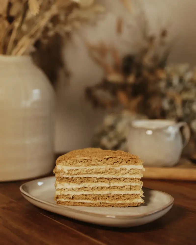 Medovyk from Lila Bakery is a traditional Eastern European honey cake made from multiple thin, tender layers flavored with honey and filled with a light, creamy filling. The dough is usually gently cooked with honey before baking, giving the layers a warm caramel-like aroma and a beautiful golden color.