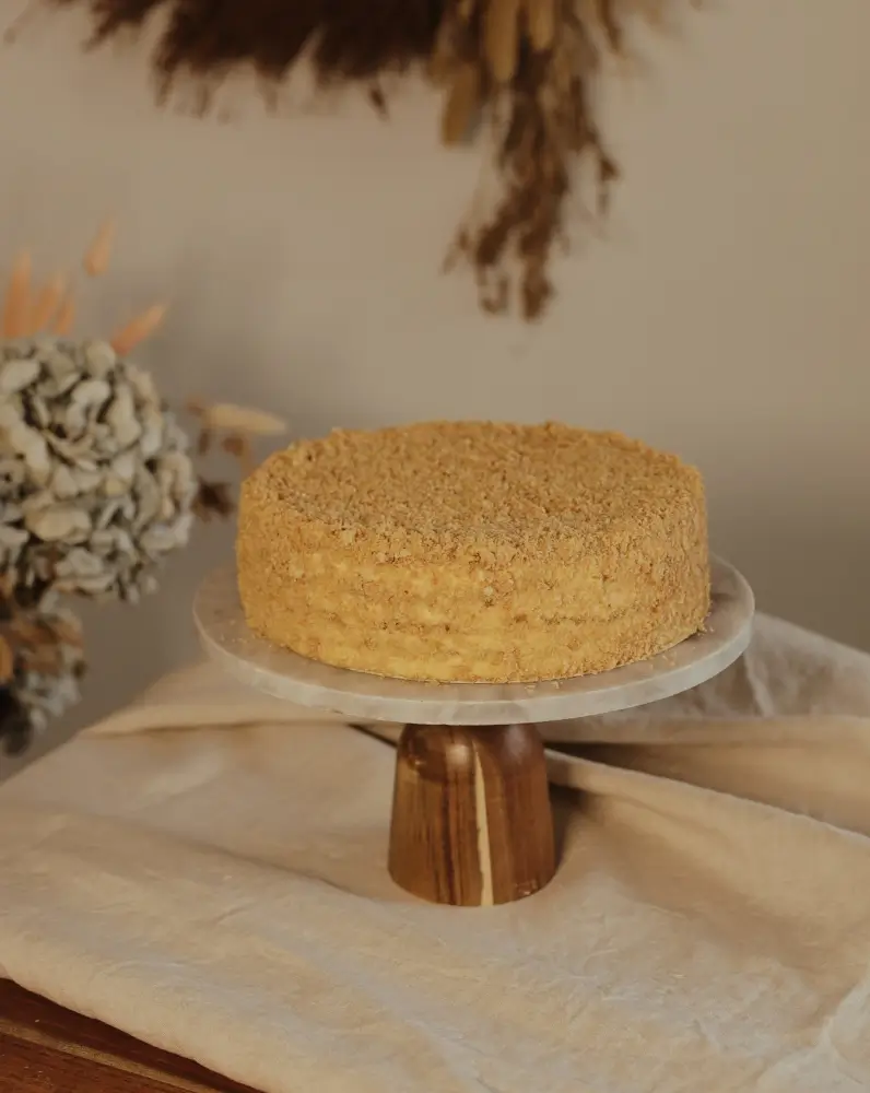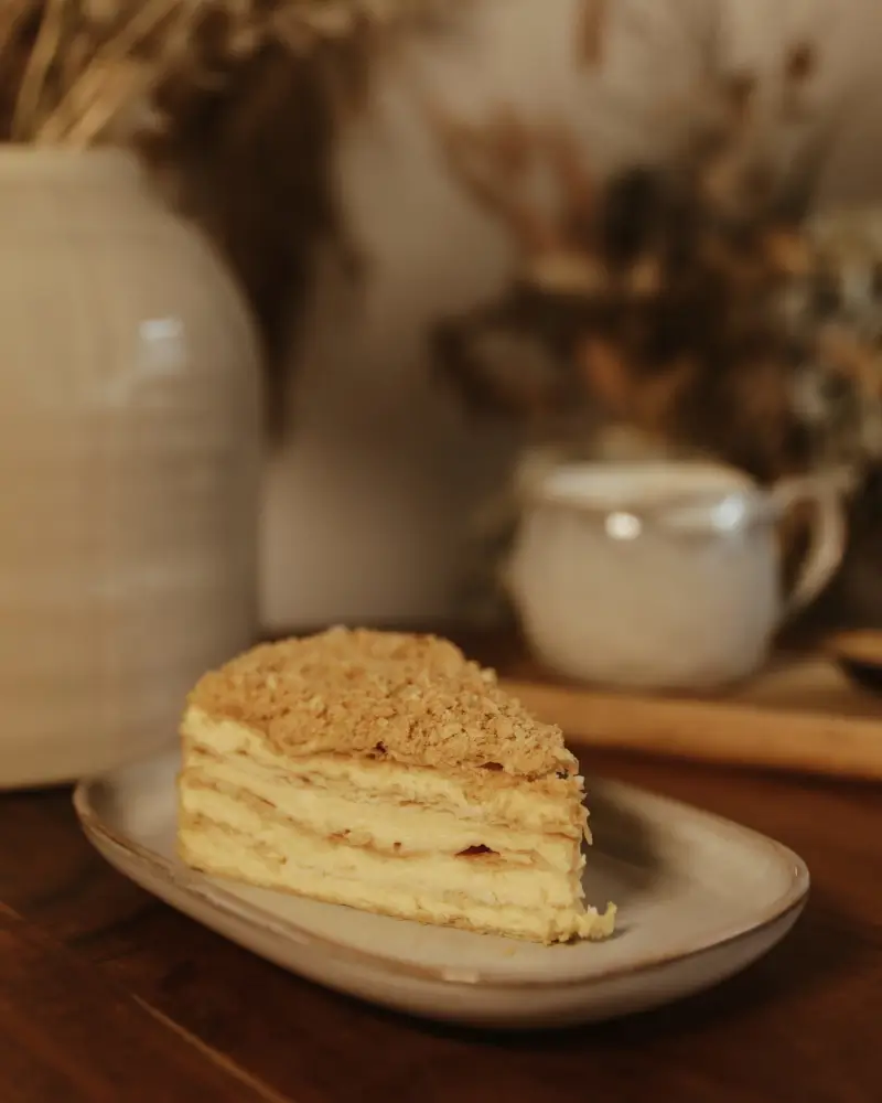 Napoleon cake from Lila Bakery is a classic layered dessert made from multiple thin, crisp sheets of puff pastry and a rich, smooth custard cream. After assembly, the cake is left to rest so the layers soften and absorb the cream, creating a tender, melt-in-the-mouth texture.